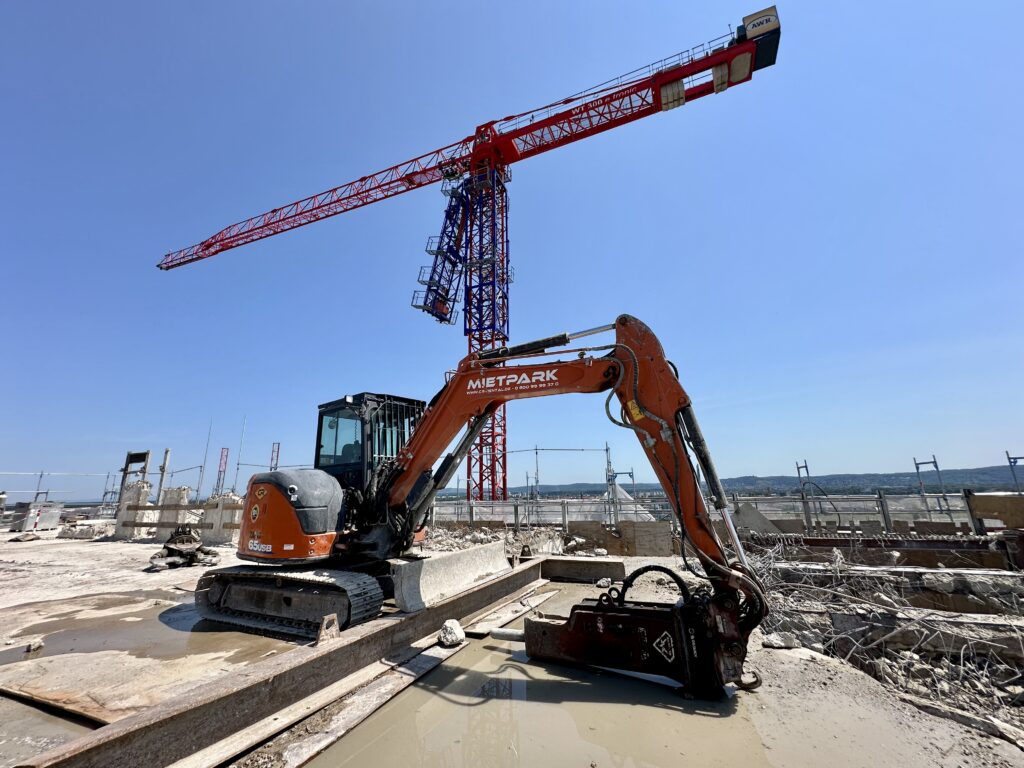 Dieser Bagger steht auf dem Hochhaus und bricht es Stück für Stück ab. | Quelle: Melanie Hofheinz