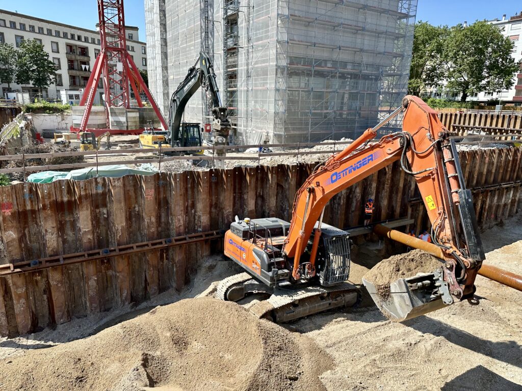 Während der Hochbau noch abgerissen wird, werden nebenan schon die Vorbereitungen für die Tiefgarage geschaffen. | Quelle: Melanie Hofheinz