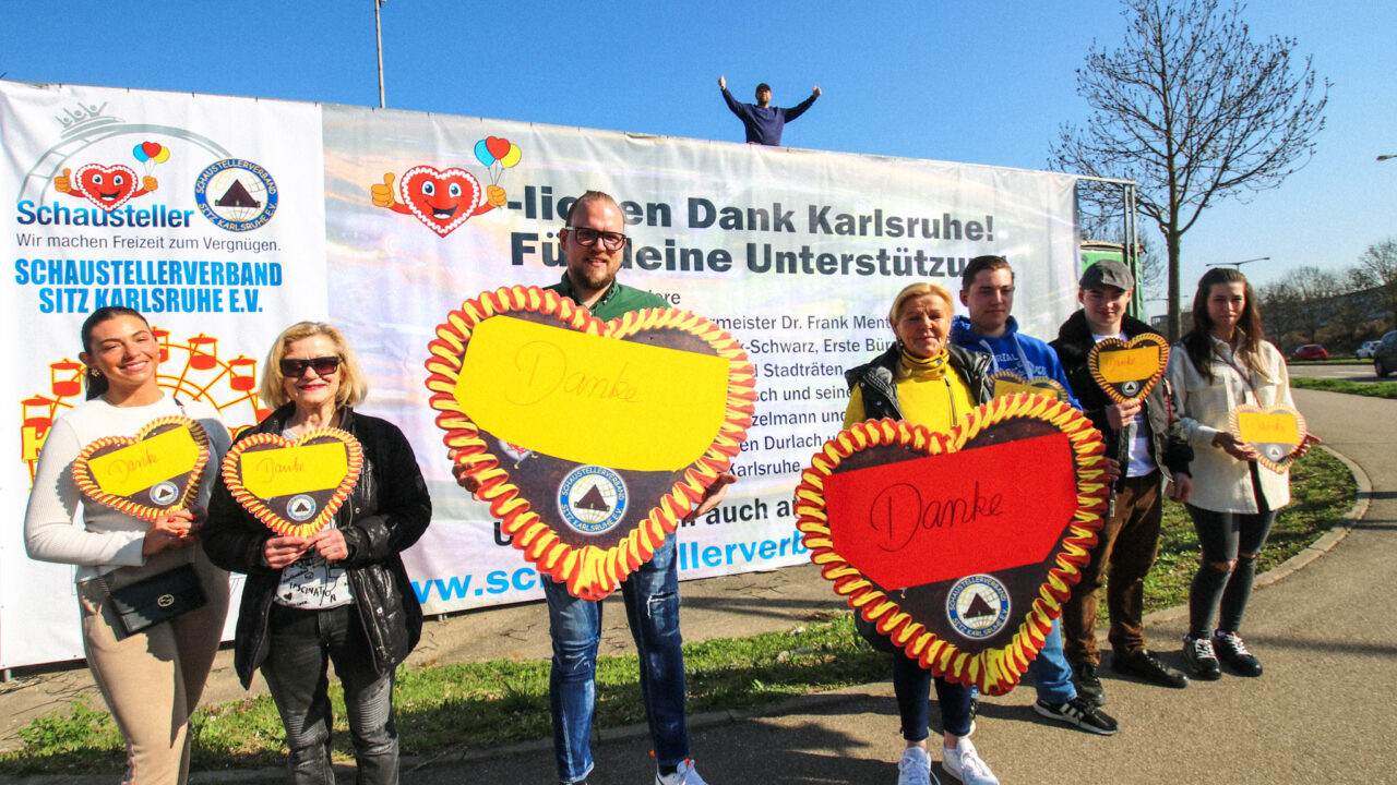 Die Schausteller haben auf dem Karlsruher Messplatz ein „Danke“-Plakat aufgestellt. Dieses soll ihre Dankbarkeit für die Unterstützung während der Corona-Pandemie zum Ausdruck bringen. Zudem blicken die Schausteller auf das anstehende Frühlingsfest.
