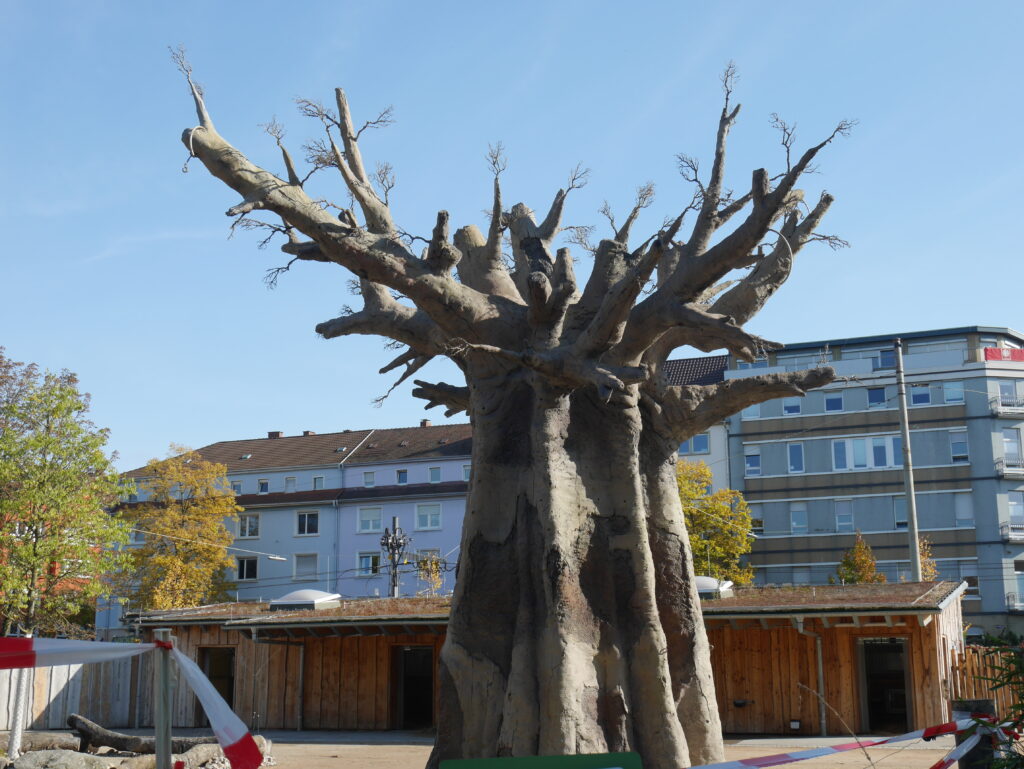 Mitten auf der Anlage ist nun ein monumentaler Baobab, auch als Affenbrotbaum bekannt, zu sehen. Dieser Kunstbaum stellt das Wahrzeichen der neuen Anlage dar. Denn der Baobab soll nach der Fertigstellung der gesamten Anlage eine besondere Funktionalität für die Fütterung der Giraffen übernehmen.
