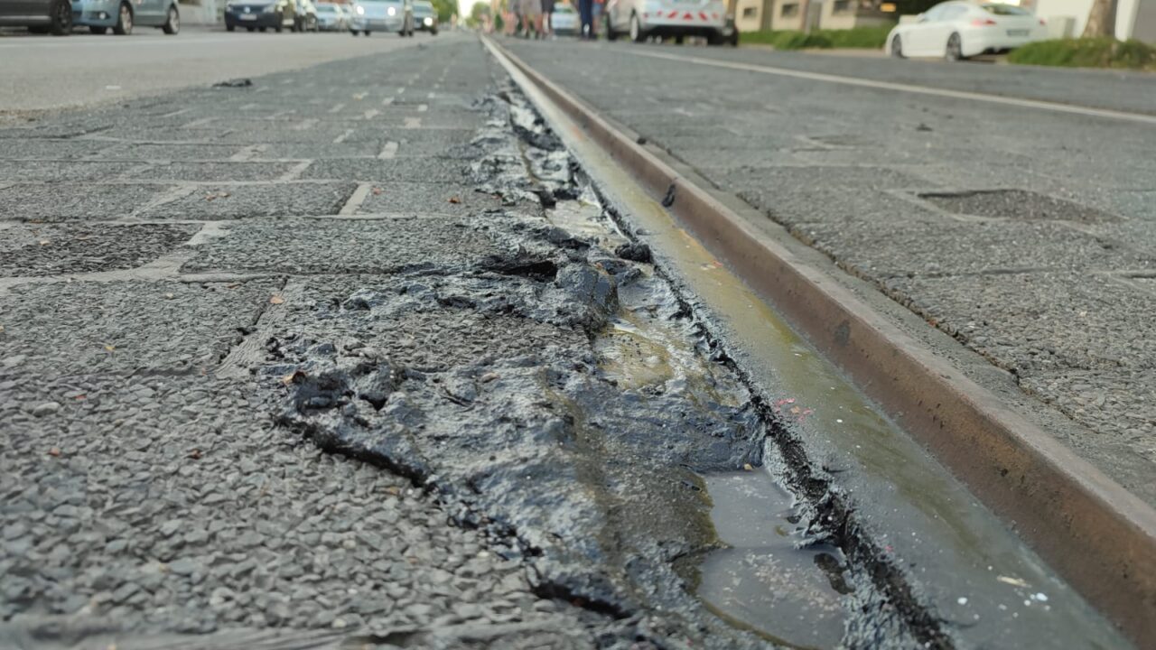 Zwischen Bahngleisen und Asphalt dient eine teerartige Masse als Puffer und Füllmaterial. Eigentlich darf die nicht weich werden. Das ist jetzt aber doch passiert: In Karlsruhe zieht man die Notbremse.