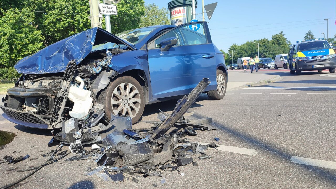Als er an der Kreuzung zur Haid-und-Neu-Straße nach rechts auf diese abbiegen wollte, übersah er am Bahnübergang offenbar das Rotlicht der Ampel und stieß mit einer in Richtung Stutensee fahrenden Straßenbahn zusammen.