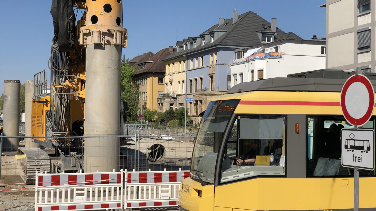 Autos und Bahnen machen am Karlstor Platz, damit Bagger und das Bohrpfahlgerät arbeiten können. Außerhalb der Gleise sind sie bereits unterwegs. Die Bohrpfähle sind aus Stahlbeton und reichen bis zu 20 Meter tief in die Erde. Der Zwischenraum zwischen den Pfählen wird verfüllt, sodass eine Baugrube entsteht, in die weder Erde noch Grundwasser seitlich eindringen kann. Ab dem 20. April können dann im Kreuzungsbereich die Gleise entfernt und die bestehenden Lücken des Baugrubenverbaus geschlossen werden.