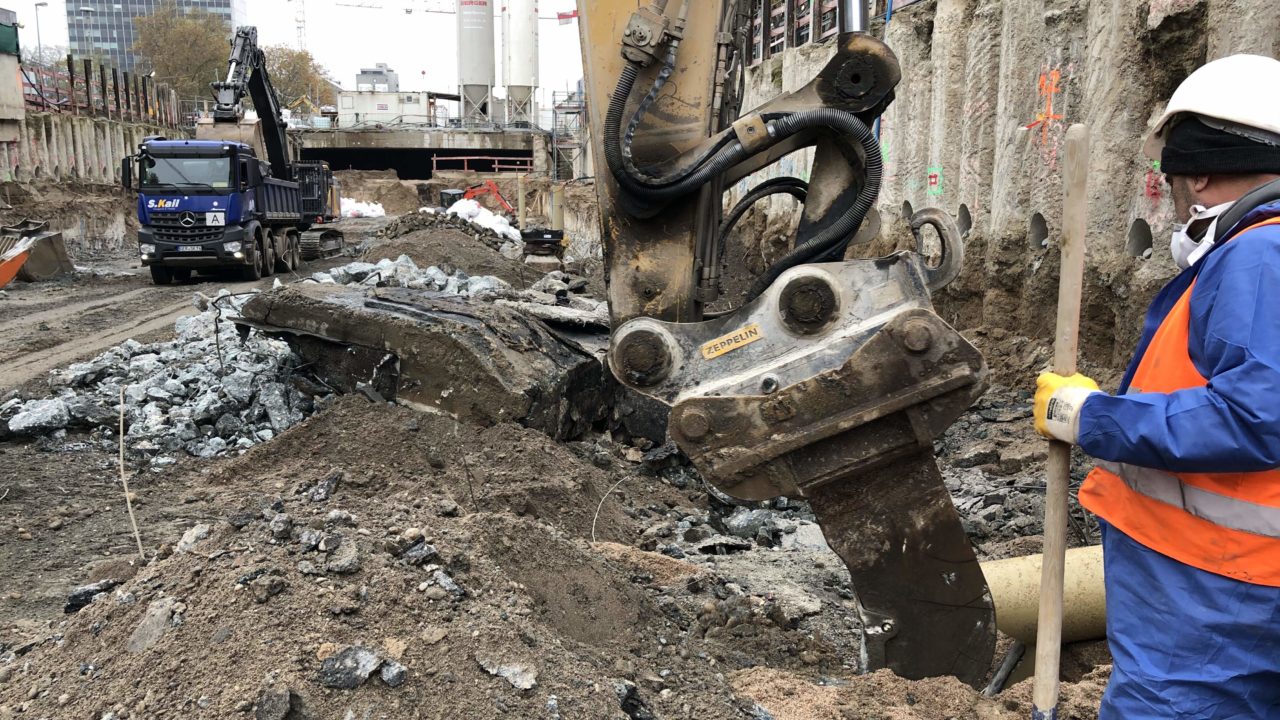 Im Baufeld W 1, also direkt am Karlstor, wird noch die Baugrube hergestellt, in der dann später der Tunnelboden, die Wände und anschließend die Tunneldecke betoniert werden. Im westlichen Bereich dieses Baufeldes wird gar noch die Weichgelsohle eingebracht – die Schutzschicht, die das Eindringen von Grundwasser in die Baugrube verhindern soll.
