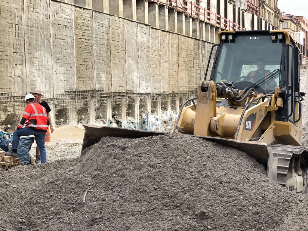 Auch unterirdisch gehen an dieser Stelle die Bauarbeiten weiter. Hier entstehen Tunnelaußen- und Tunnelmittelwände sowie die Decke – zumindest dort, wo sie noch nicht angelegt ist. Arbeiten am künftigen Autotunnel laufen auch entlang fast der gesamten Kriegsstraße. Angrenzend zum Mendelssohnplatz wird zum Beispiel Erde ausgehoben, um dem künftigen Tunnel Platz in der Grube bieten zu können.