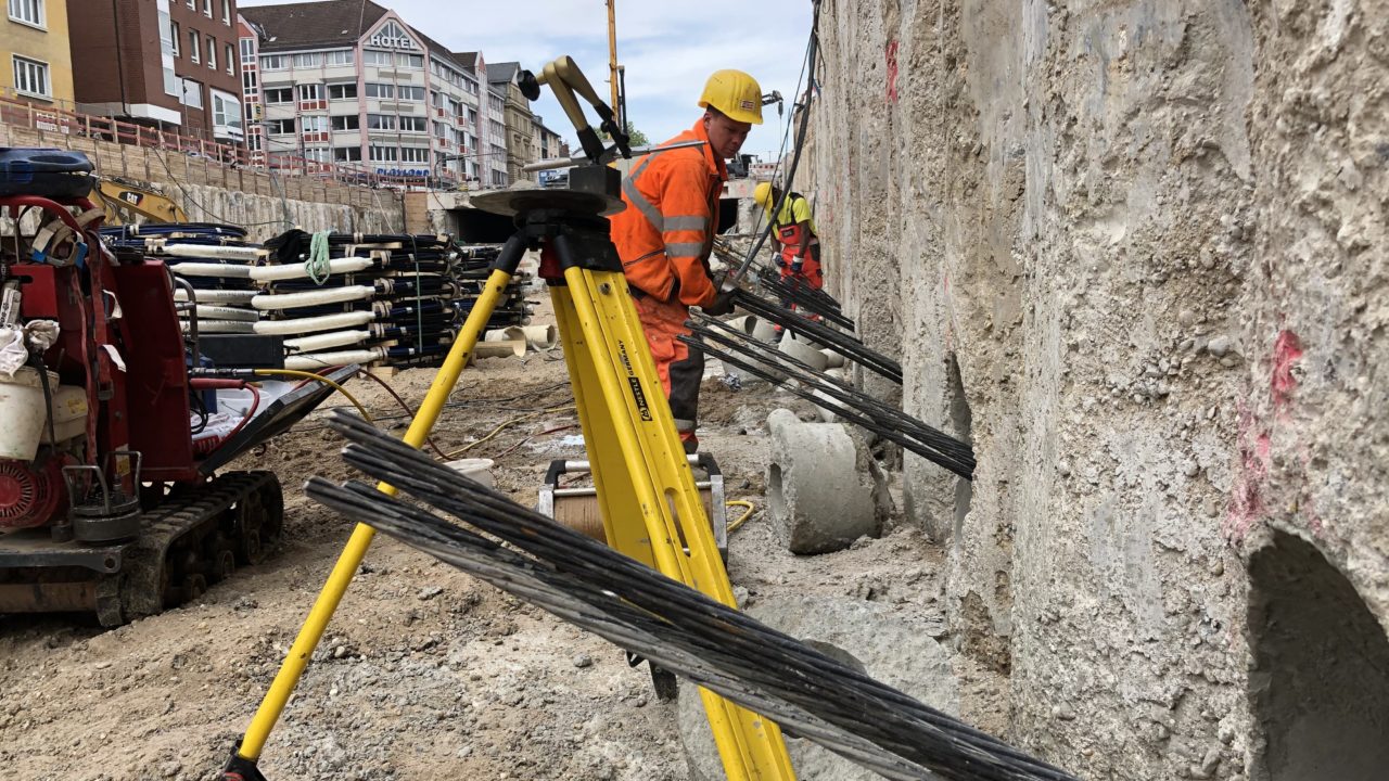 Schon seit einiger Zeit wurde dort eine Wand begonnen. Diese besteht aus Bohrpfählen aus Stahlbeton, die bis zu 20 Meter tief in die Erde reichen. Der Zwischenraum zwischen den Pfählen wird verfüllt, sodass eine Baugrube entsteht, in die weder Erde noch Grundwasser seitlich eindringen kann. Diese Wand wird nun auch dort vervollständigt, wo bisher oben noch die Bahnen und Autos unterwegs waren.