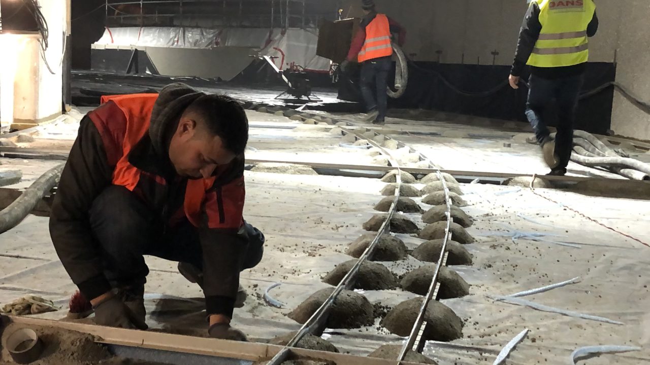 Die Fahrgäste im Straßenbahntunnel unter der Kaiserstraße werden an den Haltestellen auf hellen Fließe laufen – auf den Zwischenebenen werden aktuell Terrazzo-Böden verlegt. In einigen Bereichen sind diese Arbeiten zudem schon abgeschlossen.