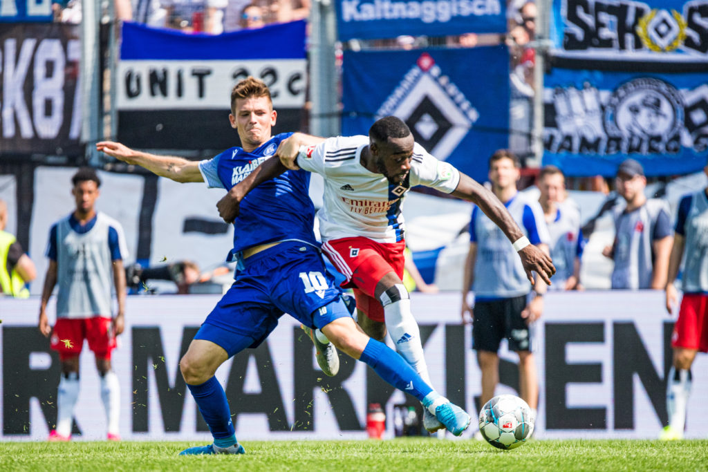 Marvin Wanitzek (KSC 10) in vollem Körpereinsatz gegen den HSV.