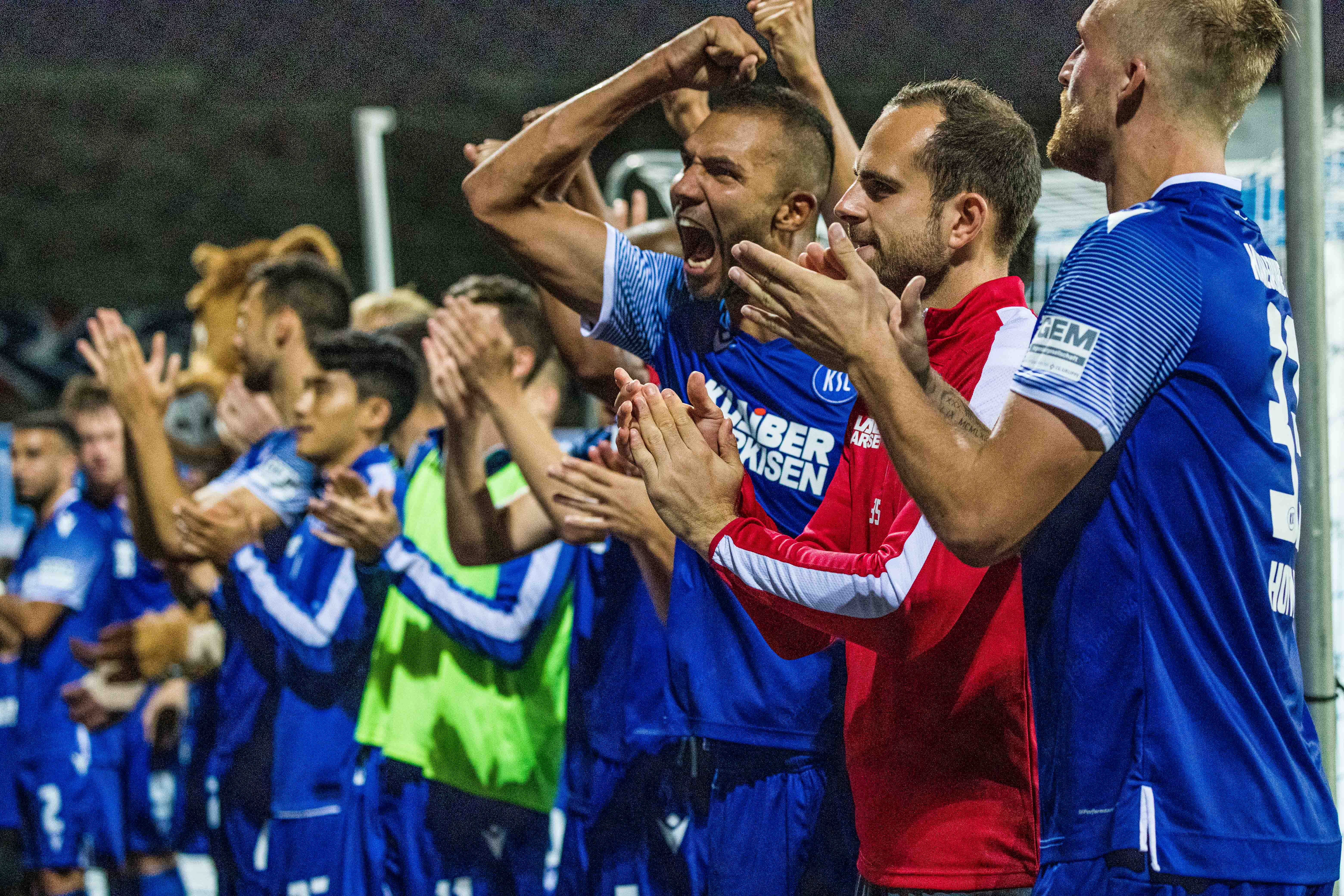 Die Karlsruher jubeln vor der Fantribüne. Daniel Gordon (KSC 3) schreit es raus. | Quelle: TMC-Fotografie.de | Tim Carmele