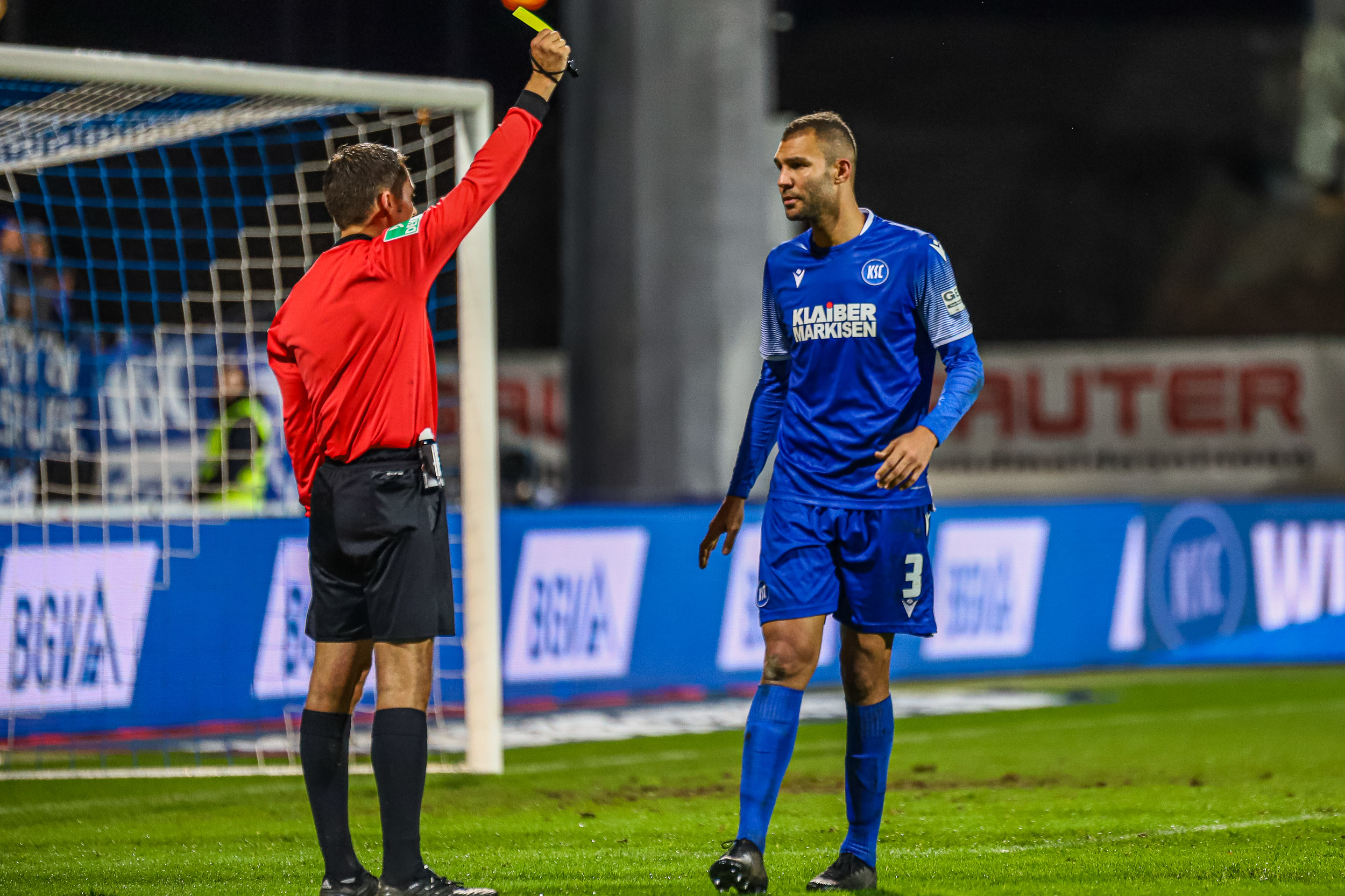Daniel Gordon (KSC 3) sieht gelb nach Stürmerfaul gegen Torwart Heinz Lindner (Wehen Wiesbaden 34) | Quelle: TMC-Fotografie.de | Tim Carmele