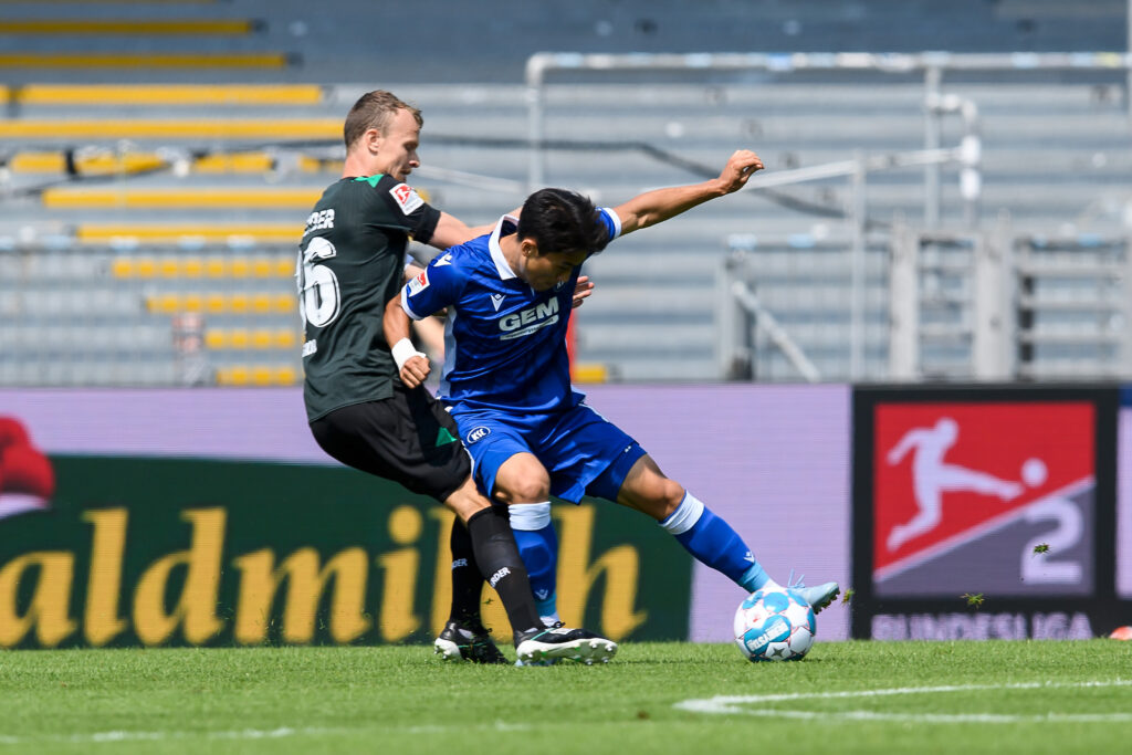 Kyong-Rok Choi (KSC) im Zweikampf mit Christian Groß (Werder). | Quelle: GES/Helge Prang