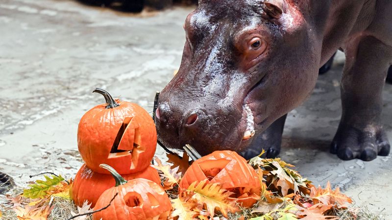 Haps und weg ist der Kürbis. Halloween, ein vier Jahre altes Flusspferd, mampft zwar vornehmlich Gras und Heu. Anlässlich des bevorstehenden Halloweentages am 31. Oktober, passenderweise auch Geburtstag des Bullen, verzehrt das Tier aber auch mal einen Halloween-Kürbis mit Schnitzerei. Dank seines großen Maules kann Halloween den Kürbis auf einmal ins Maul nehmen und ziemlich fix auffressen, wie der Sprecher des Karlsruher Zoos, Timo Deible, erzählt. Wie schwer der Bulle sei, sei unklar – «noch hatten wir ihn nicht auf der Elefantenwaage», sagt Deible. Ausgewachsen sei das Tier, das auch gerne Obst und Gemüse fresse, aber noch nicht.