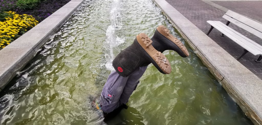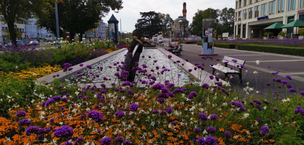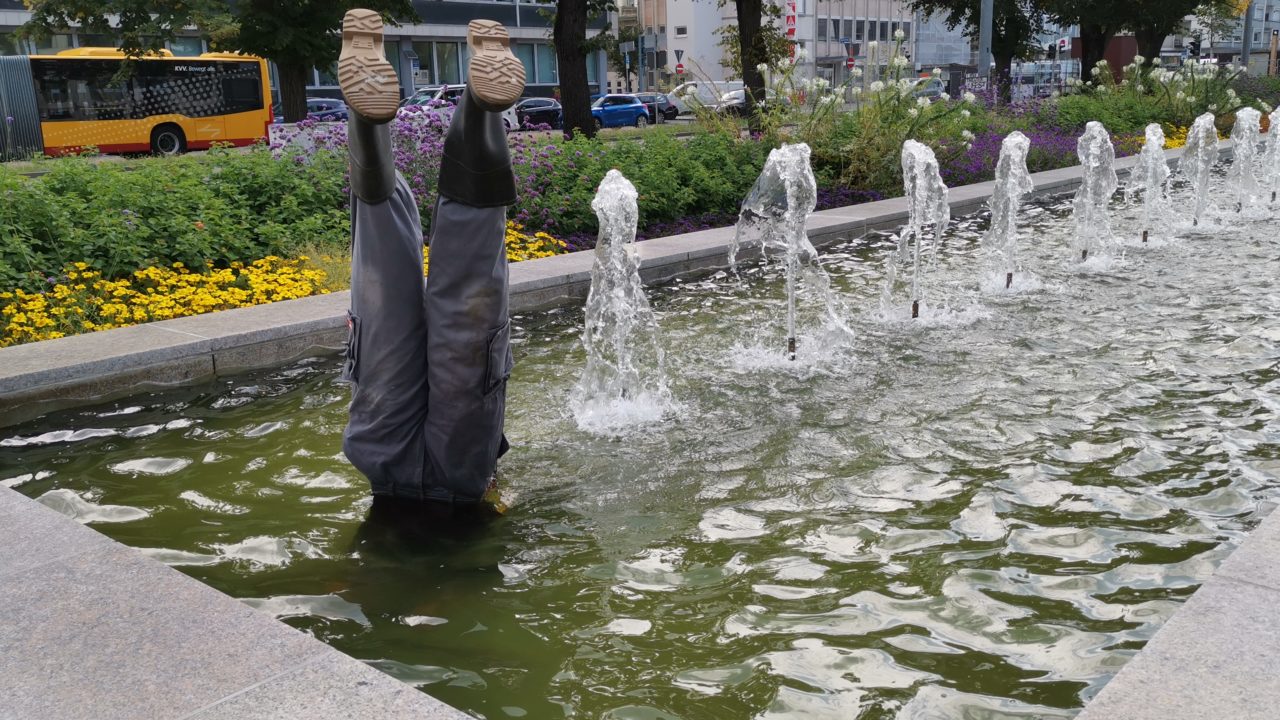Seit Montag, den 26. August 2019 bietet sich den Karlsruhern am Festplatz an der Ettlinger Straße ein ungewöhnliches Bild: Eine über ein Lattengerüst gezogene Hose mit Gummistiefeln taucht kopfüber ins Wasser, genauer – in den dortigen Springbrunnen vor dem Kongresshotel. Doch was hat es damit auf sich?