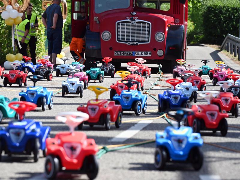 News aus Baden-Württemberg Kurioser Weltrekord: 50 Bobby-Cars ziehen Kelly-Bus 50 Meter weit