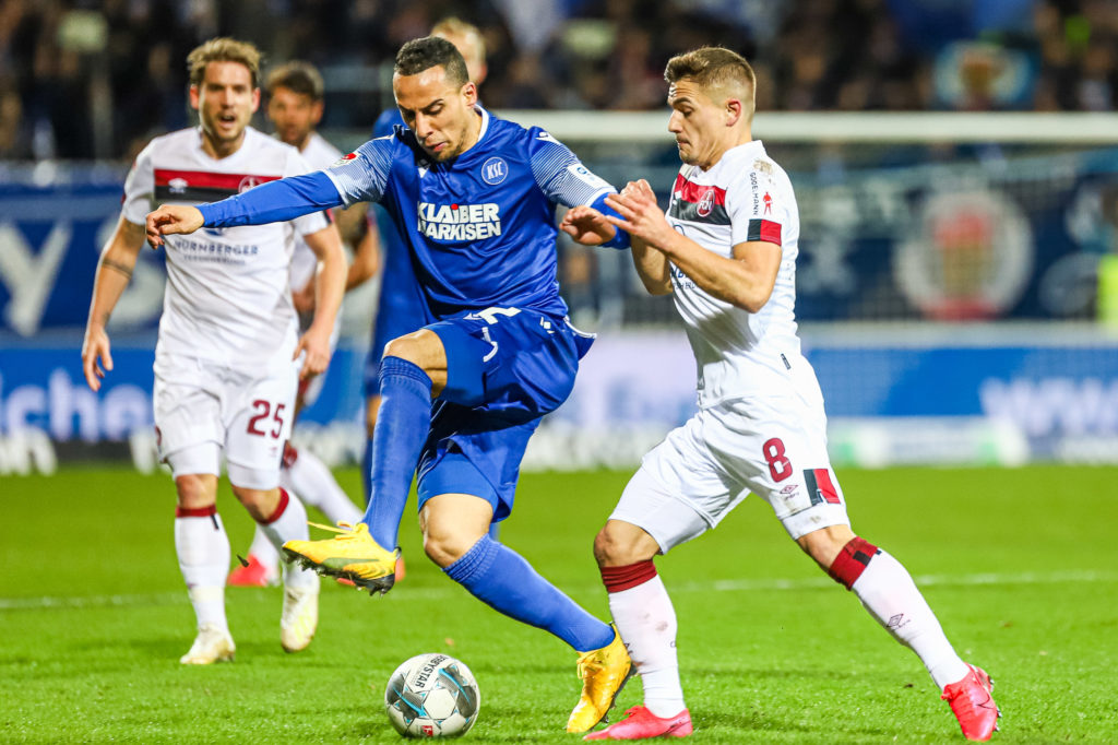Änis Ben-Hatira (KSC 32) im Zeikampf mit Nikola Dovedan (1. FC Nürnberg 8).