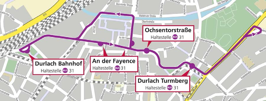 Busverkehr: Zwischen 12 Uhr und 15.30 Uhr können die Buslinien 21, 23, 24 und 26 die Haltestelle Schlossplatz nicht mehr anfahren. Sie fahren deshalb über die Badener Straße und Haltestelle Karl-Weysser-Straße zu ihren regulären Haltepunkten an der Haltestelle Durlach Turmberg.