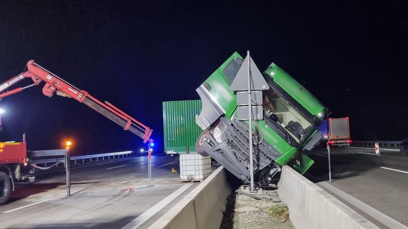Nach einem Unfall auf der Autobahn 5 ist ein Lastwagen zwischen den beiden Betonleitplanken in der Mitte der Fahrbahn liegengeblieben.