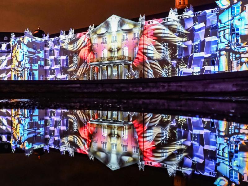 Schillernde Farben, geometrische Muster und Gesichter mit Sonnenbrillen samt Spiegelungen im Wasser: Nach einem Jahr im virtuellen Raum kann das Publikum die Schlosslichtspiele seit Mittwoch wieder auf der Fassade des Karlsruher Schlosses bestaunen.