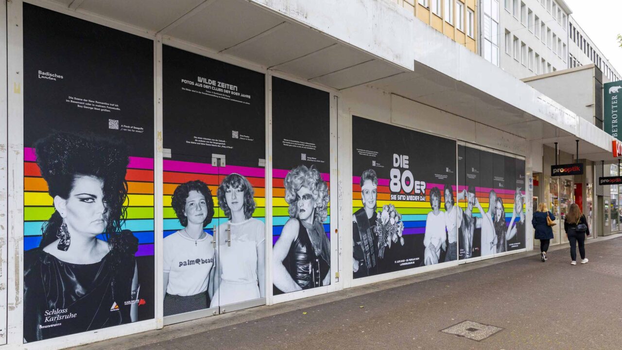 In der Karlsruher Innenstadt sind ab sofort an mehreren leeren Ladengeschäften Bilder der 80er Jahre zu sehen. Die kreative Schaufenstergestaltung ist eine Maßnahme des Citymarketings, der KME und der Stadt Karlsruhe zur Steigerung der City-Attraktivität.