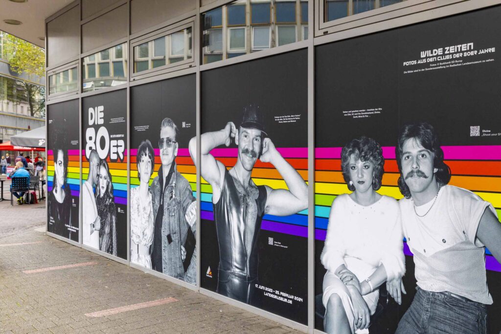 In zwei derzeit leerstehenden Ladengeschäften in der Kaiserstraße/Ecke Waldstraße und in der Kaiserstraße 191/193 sind nun die Bilder des Fotografen Burkhardt ED Rump zu sehen. Sie zeigen Schwarzweißfotografien auf retro-bunter Grafik und sollen auf ein 80er Jahre Event im Juni aufmerksam machen.