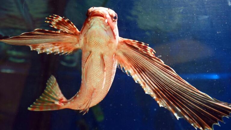 Es sieht aus, als habe er links und rechts große Fächer am Körper: Ein Flughahn schwimmt seit einigen Wochen durch ein Becken im Staatlichen Naturkundemuseum Karlsruhe.