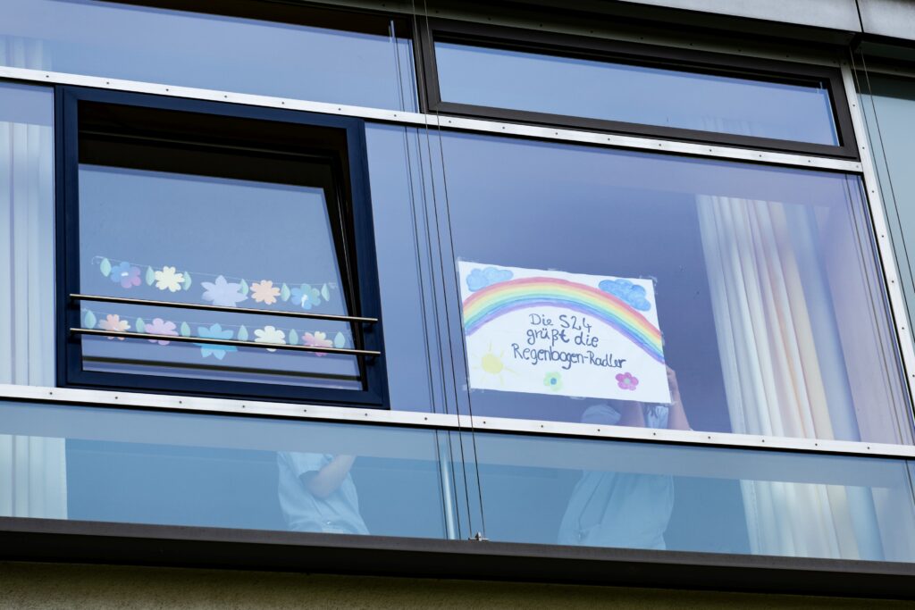 Die Patientinnen und Patienten der onkologischen Station S24 konnten aufgrund ihrer schweren Erkrankung nicht mit in die Räuberburg kommen. Sie hatten aber die Gelegenheit, dem Radler-Team vom Spielzimmer aus zuzuwinken.