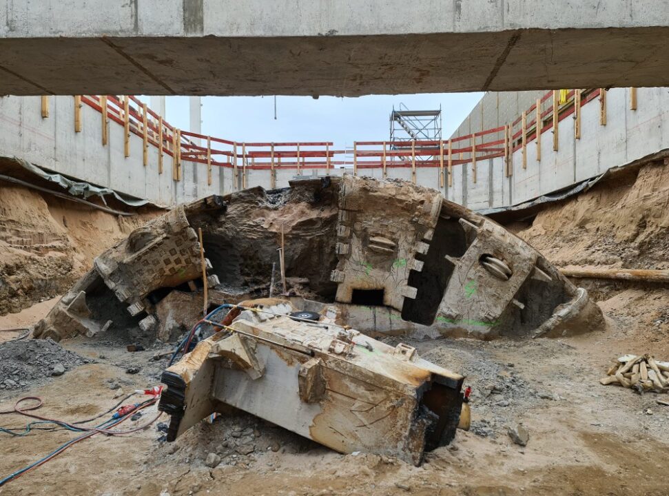 Tunnelmaschine in der Baugrube – die obere Hälfte des Schneidrads ist bereits zerlegt. | Quelle: DB AG