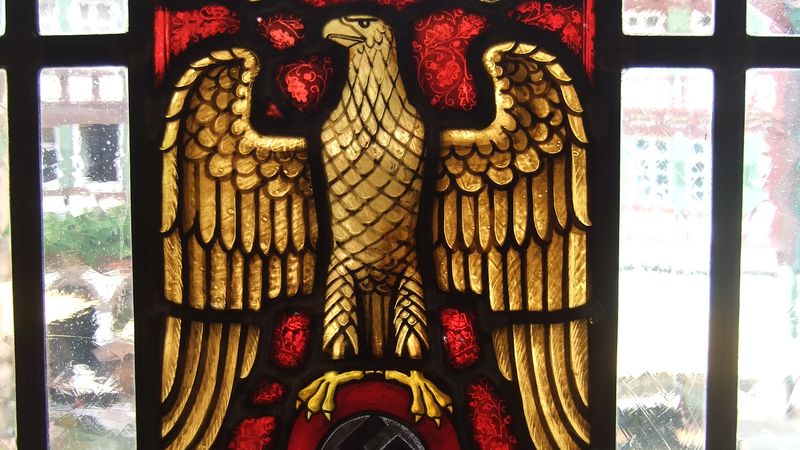 Das Hakenkreuz ist mitsamt Reichsadler in einem von mehreren stadtgeschichtlichen Bild- und Wappenmotiven auf einem dreiteiligen Fenster zu sehen. Deren Gestaltung war 1938 in Auftrag gegeben worden. Vermutlich in den 1960er Jahren sei das Hakenkreuz geschwärzt worden. Im Zuge einer Sanierung 1988 wurden nach Angaben des Stadtarchivs die Zusätze «1933-1945» und «NS Diktatur» über beziehungsweise unter Adler und Hakenkreuz angefügt, «um den Dokumentationscharakter des Fensterbildensembles zu betonen».