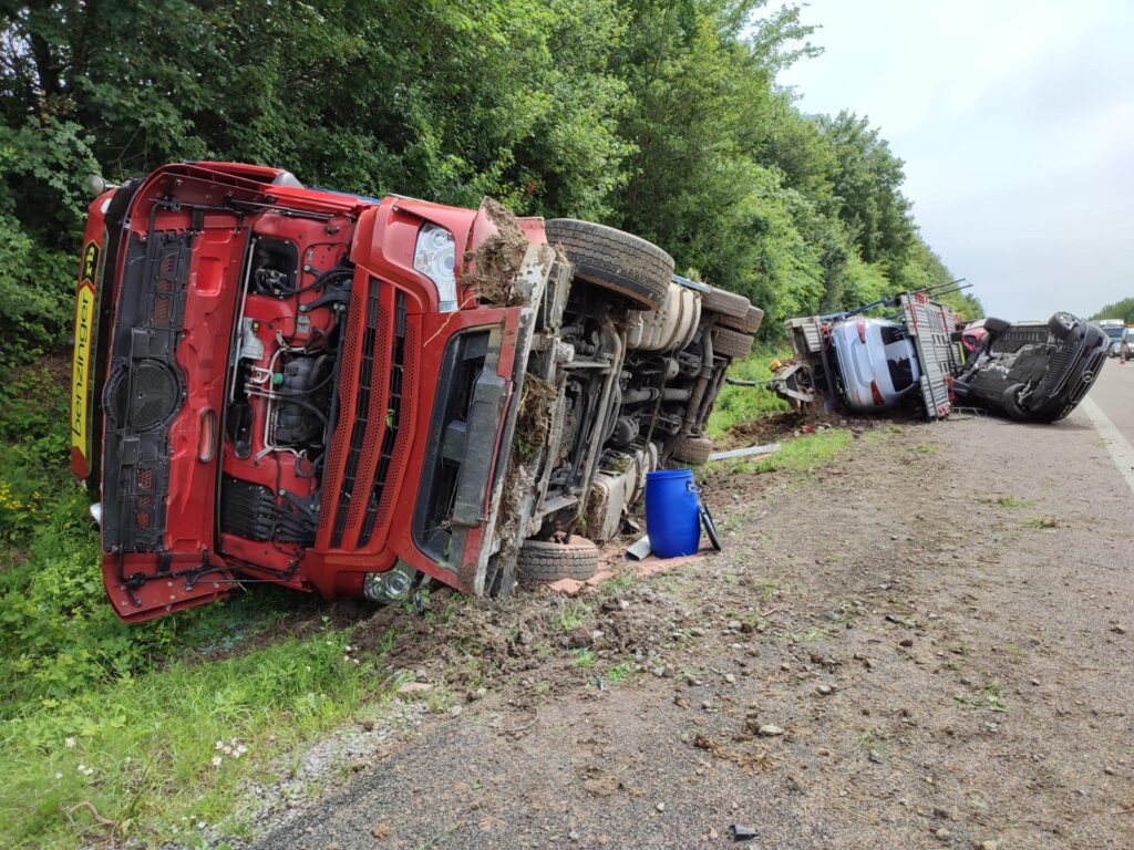 In der Folge stürzte der Lastzug nach links um. Der Fahrer konnte sich glücklicherweise selbstständig aus seinem Führerhaus befreien und wurde durch den Rettungsdienst zur ambulanten Behandlung in ein Krankenhaus gebracht.