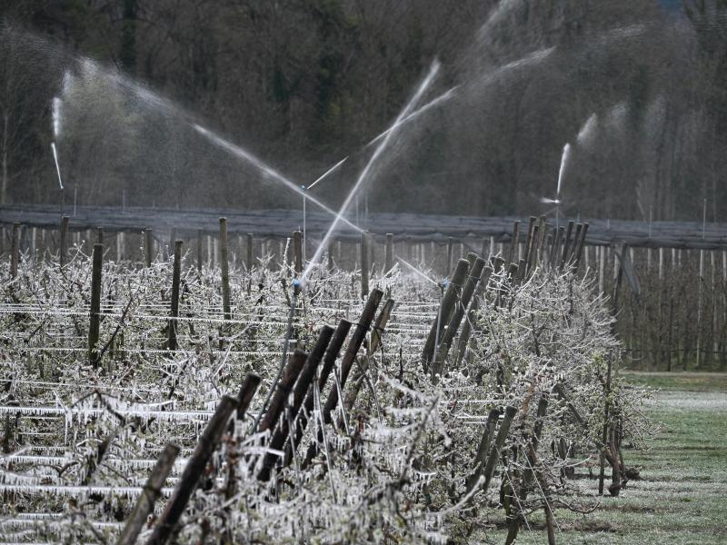 Die Kälte machte auch den Obstbauern am Bodensee zu schaffen. Um ihre Plantagen vor dem Frost zu schützen, setzten sie in der Nacht zum Montag auf offenes Feuer oder Bewässerung für eine Schutzschicht aus Eis.