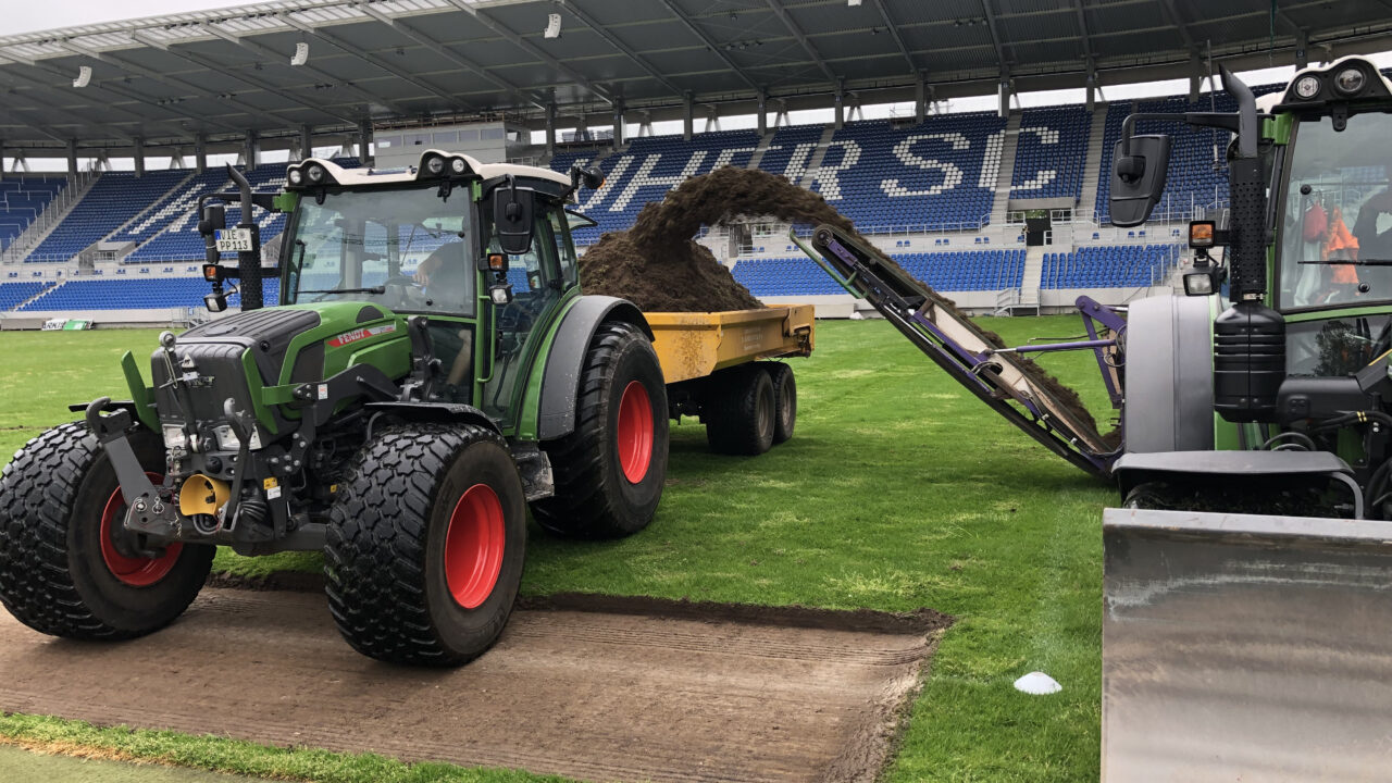 Seit Montag, 07. Juni 2021, wird der alte Rasen im Fußballstadion im Wildpark entfernt: Dazu wird der Rasen in zwei Arbeitsgängen inklusive des unter der Grasnarbe liegenden Substrates bis in eine Tiefe von 18 Zentimeter abgefräst. Der so aufbereitete Boden ist ein ideales Pflanzen-/Bodensubstrat – und die Grasnarbe muss nicht in einem aufwändigeren Verfahren abgeschält und separat entsorgt werden.
