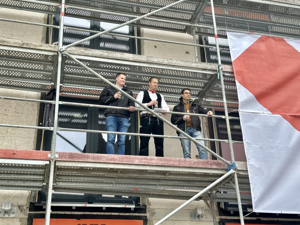 Ein außergewöhnliches Richtfest feierte die Volkswohnung am Mittwoch, 06. März 2024: In der Josef-Schofer-Straße 2 in der Karlsruher Nordweststadt wurde der Richtspruch durch den Zimmermeister nicht für einen Neubau, sondern ein Bestandsgebäude verlesen.