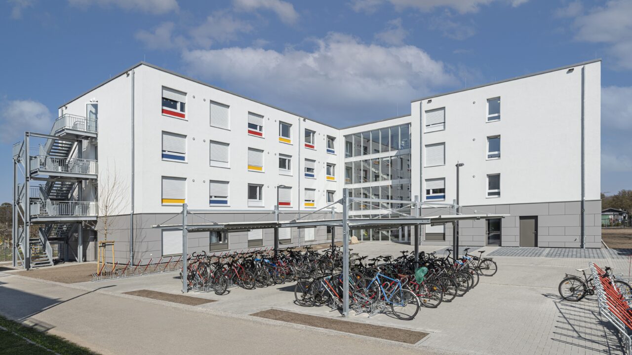 Das neue Wohnheim befindet sich in unmittelbarer Nähe des KIT Campus Süd und bietet 103 möblierte Zimmer mit eigener Nasszelle, Gemeinschaftsküchen, Aufenthaltsräume sowie einen Balkon je Etage.