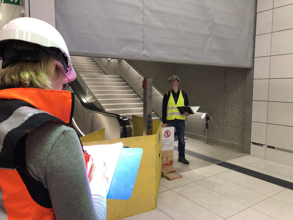 Auch die Fluchtwege-Beschilderung ist inzwischen angebracht, während die Fluchttüren – zwei unmittelbar nebeneinander liegende, jeweils nur von einer Seite und nur in eine Richtung zu öffnende Stahltüren – noch nicht vollständig in der die Röhren trennenden Stahlbeton-Mittelwand montiert sind.