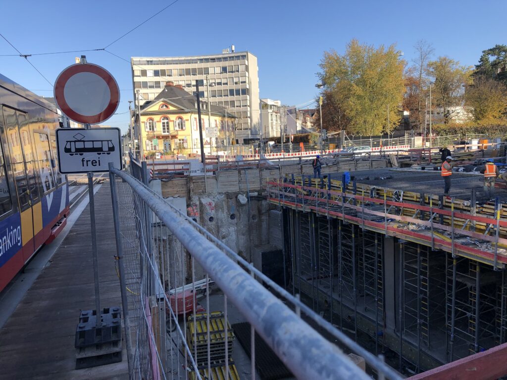 In den nächsten Wochen endet direkt unter dem Karlstor der Abbruch der alten Sohle der früheren Unterquerung der Kriegsstraße unter der Karlstraße hindurch und der Aushub der Baugrube auf Endtiefe bzw. die Baugrubensohle. Darauf aufbauend folgt schließlich der Rohbau des neuen Tunnels.