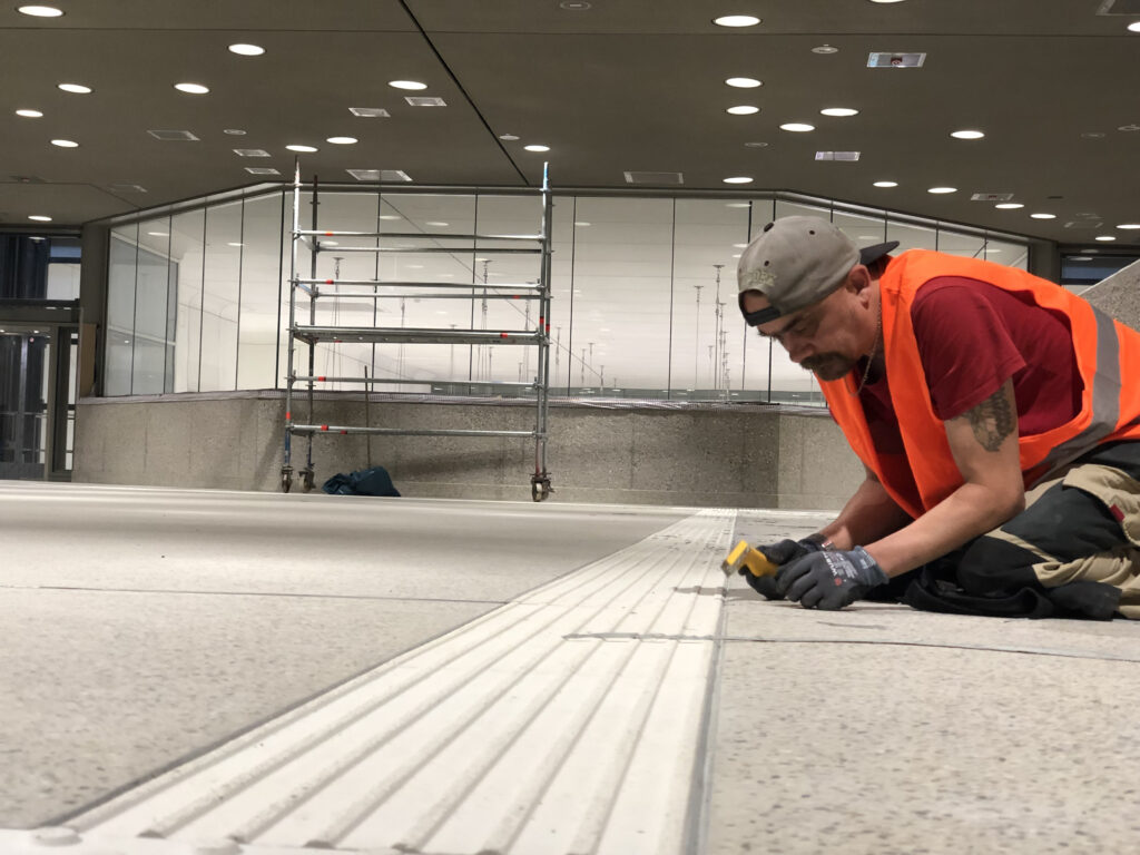 Der Innenausbau im Stadtbahn- und Straßenbahntunnel der Kombilösung verzeichnet nach wie vor Restarbeiten. Das Spektrum ist wirklich breit: Letzte Verkleidungsbleche werden dabei ebenso befestigt wie die letzten Meter Handlauf an den Treppenabgängen für die Fahrgäste.