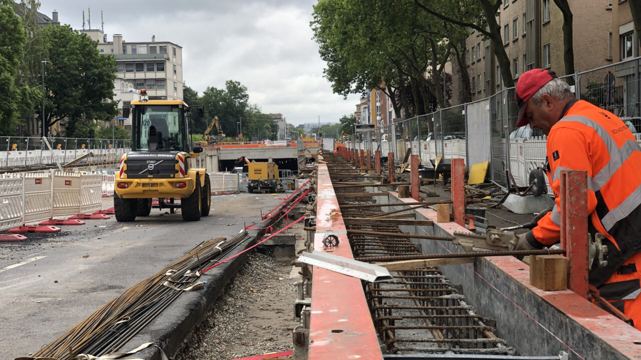 Beim Umbau der Kriegsstraße mit einer neuen Gleistrasse und dem darunterliegenden Autotunnel macht der Bau auch der Verkehrsflächen weiter Fortschritte: