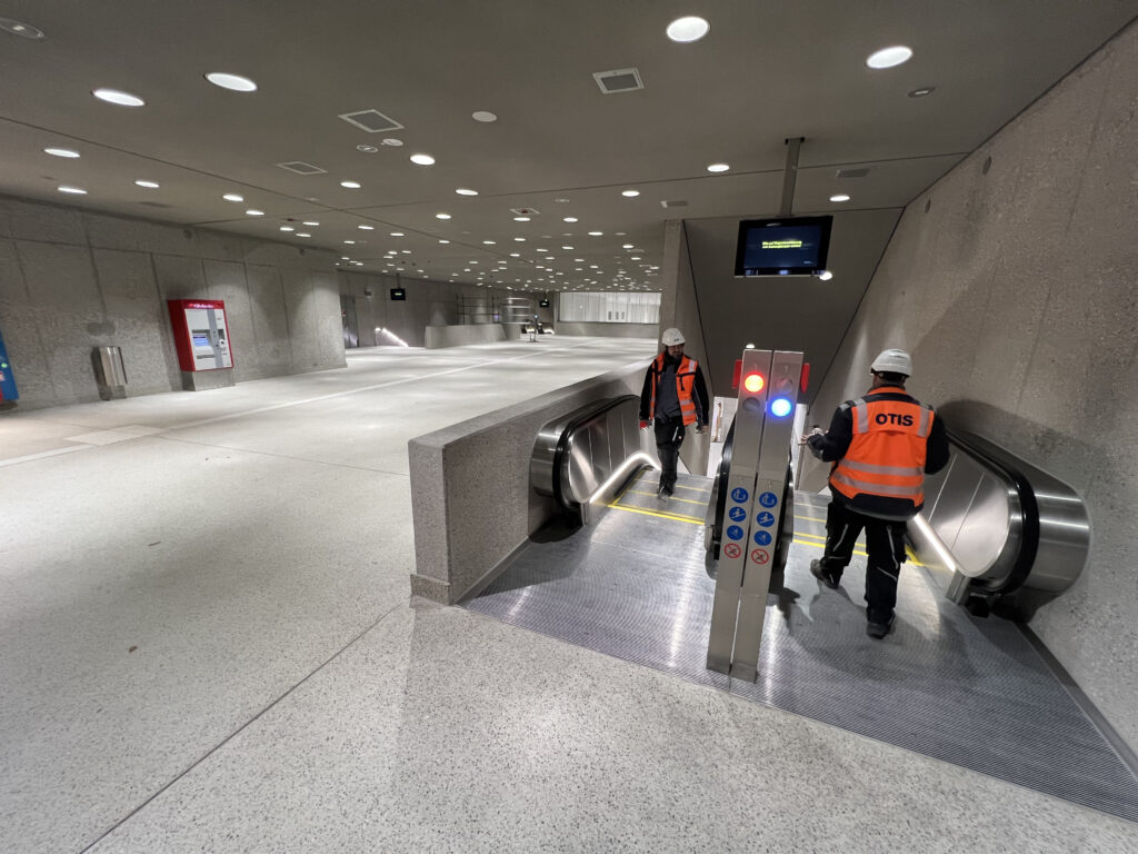 Die demontierten Einhausungen und nicht mehr vorhandenen Drehkreuze vor den Eingängen geben den Blick in die Eingänge frei – freilich nur bis zum Rolltor am unteren Ende eines jeden Treppenabgangs, das den Zutritt in die Haltestellen nicht nur jetzt, sondern künftig auch in der „Nachtpause“ verwehrt.