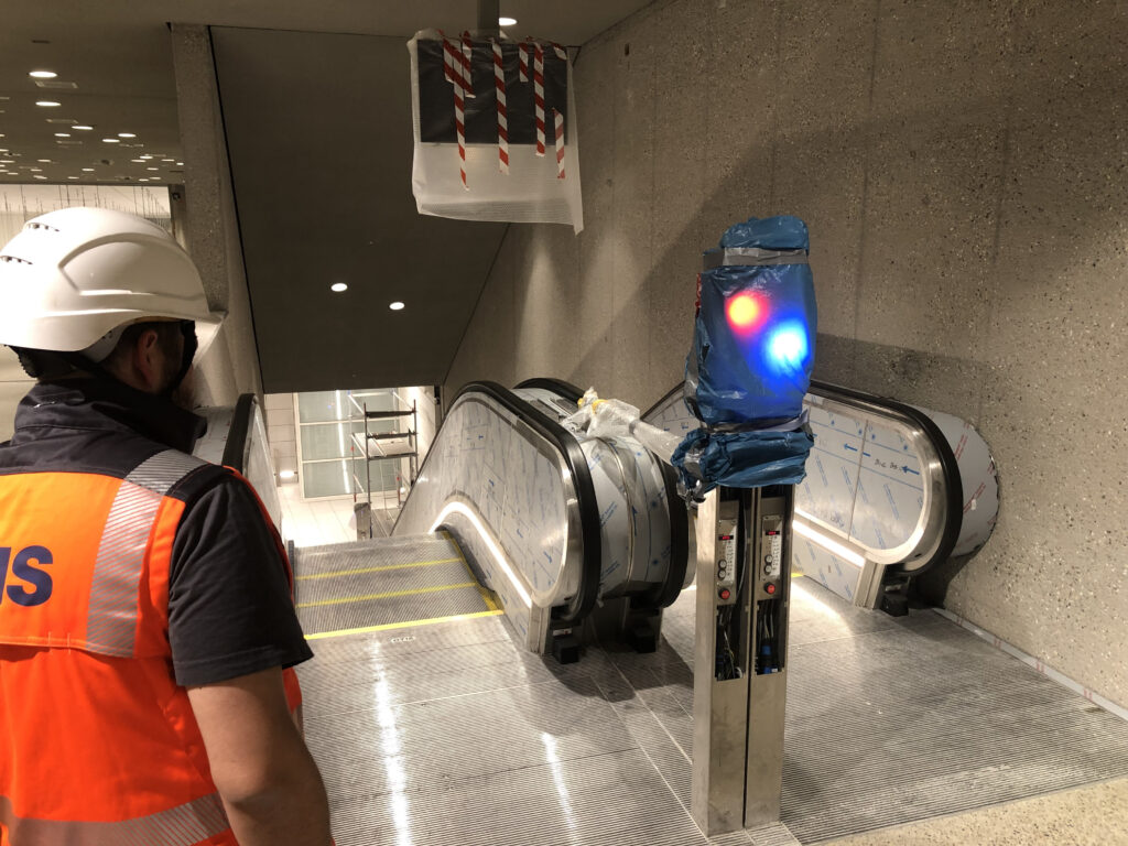 So sind die Verkleidungen der Wände und Decken immer mal wieder ein Thema: Denn wenn Elektriker noch an die eigentlichen Rohbauwände und an die darin oder davor laufenden Kabelschächte heran und dort arbeiten müssen, kann eben auch die Verkleidung erst spät geschlossen werden. So schließt sich jetzt erst der „Schlitz“ zwischen der in vier Meter Höhe befindlichen Wandverkleidung aus Betonwerksteinen und der darüber folgenden Trockenbauverkleidung: