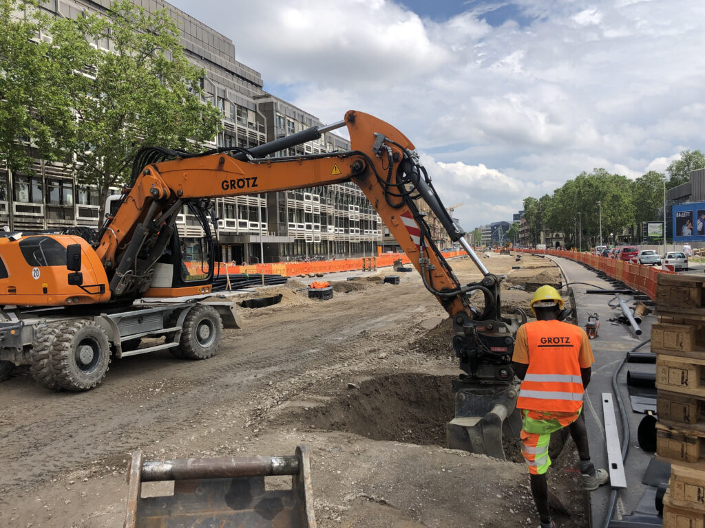 Zu letzterem gehört auch das im Zuge der jetzigen Bauarbeiten bereits angelegte künftige Grün mit den zumeist vier Baumreihen, die sich von der Ludwig-Erhard-Allee im Osten bis zum Karlstor im Westen ziehen werden.