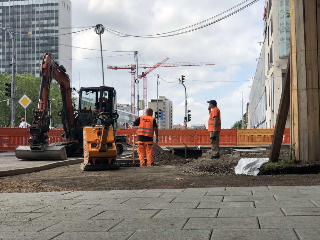 Auch oberirdisch macht der Bau gute Fortschritte: Zwischen Mendelssohnplatz und Ettlinger Tor wird die Gleistrasse gebaut, seitlich fährt der Autoverkehr in den meisten Bereichen bereits auf den endgültigen Fahrbahnen, während noch weiter an den äußeren Rändern der Kriegsstraße immer mehr Quadratmeter Gehwege gepflastert werden, erklärt die KASIG.