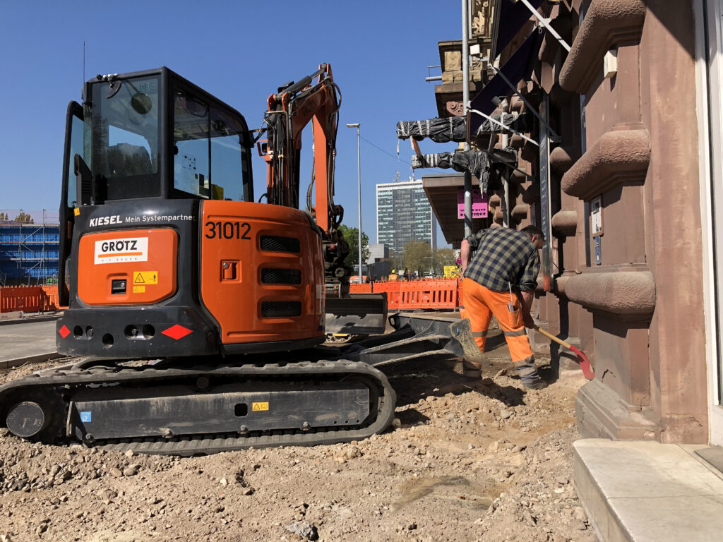 Der Bau für die drei künftig entlang der Kriegsstraße liegenden neuen oberirdischen Haltestellen ist westlich vom Mendelssohnplatz jetzt schon gut zu beobachten. Am Ettlinger Tor westlich der Kreuzung sowie vor dem Bundesgerichtshof östlich des Karlstors muss der Bau-beginn noch darauf warten, dass die Autos von den provisorischen Fahrbahnen auf die endgültigen Fahrbahnen verlegt werden.