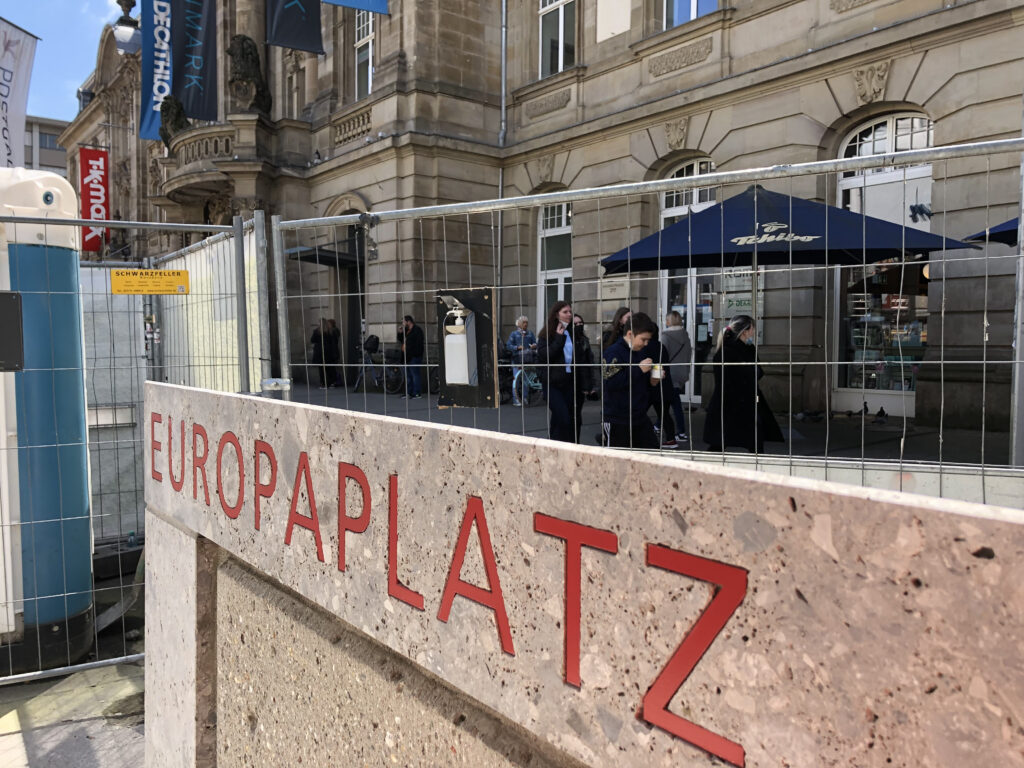 In der Kriegsstraßenmitte kündet der Bau der Gleise und auch von einer der drei künftigen Haltestellen – Rüppurrer Tor – auch von der Zukunft: In den zurückliegenden Jahrzehnten fuhr in der Kriegsstraße keine Bahn. Das wird sich mit der Inbetriebnahme der Kombilösung am 12. Dezember dieses Jahres dann ändern.