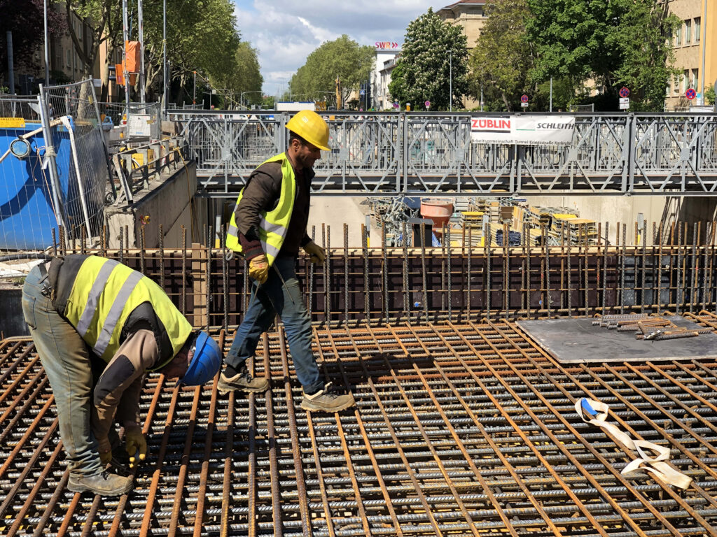 Der Umbau der Kriegsstraße mit einer oberirdischen neuen Gleistrasse und dem darunter liegenden Autotunnel erreichte am Freitag, 21. Mai) 2021, ein weiteres, wichtiges Zwischenziel: Am westlichen Ende des künftig 1,6 Kilometer langen Autotunnels, etwa 25 Meter westlich der Kreuzung der Karlstraße mit der Kriegsstraße, wurde die letzte Betondecke im Bereich des Tunnelportals hergestellt.