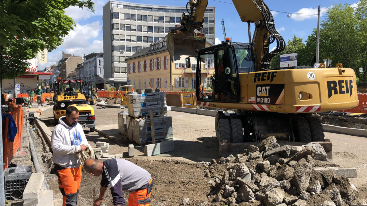 An der Oberfläche der Kriegsstraße ist das Bautempo sichtbar: Ständig wechseln die Autofahrer die Fahrspuren, zumeist fahren sie bereits auf den endgültigen Fahrbahnen. Daneben entstehen Parkbuchten, Bauminseln entstehen, die dann zur nächsten Pflanzzeit im Herbst auch mit Bäumen ausgestattet werden.