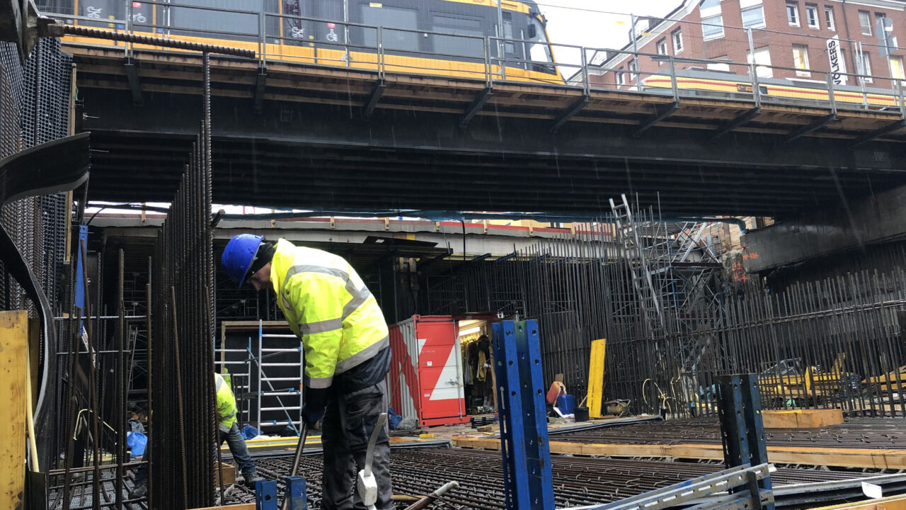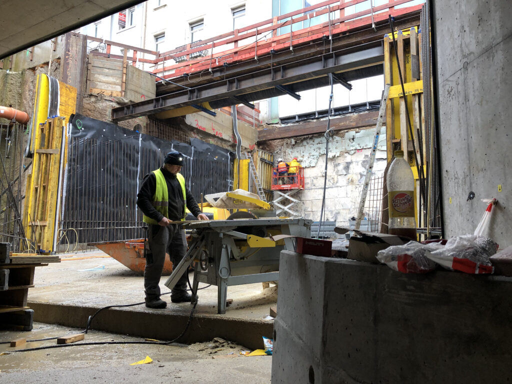 Nachdem der letzte Tunneldeckel östlich der Kreuzung hergestellt ist, gehen die Arbeiten jetzt auf der westlichen Seite weiter. Tunnelsohle, Tunnelwände, die Zwischenwand und die Deckel entstehen nun auch hier, bis zwischen den betonierten Bereichen lediglich noch das Feld direkt unter den Hilfsbrücken übriggeblieben ist, auf dem derzeit noch die Straßenbahnen fahren. Die beiden Brückenteile werden im April wieder ausgebaut, dann wird der Autotunnel auch in dieser vergleichsweise kleinen Lücke hergestellt, wird weiter erklärt.