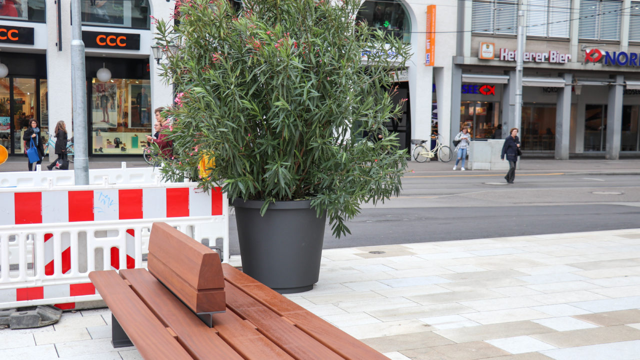 Aufgestellt wurden drei verschiedene Banktypen, die aber alle aus einer bereits vorausgewählten Produktfamilie kommen. Hinzu kommen Pflanzengefäße, die für Oleander-Pflanzen vorgesehen sind. Da große Teile des Platzes noch im Bau sind, die Bänke aber einem Praxistest unterzogen werden sollen, stehen sie außerhalb des Baustellenbereichs.