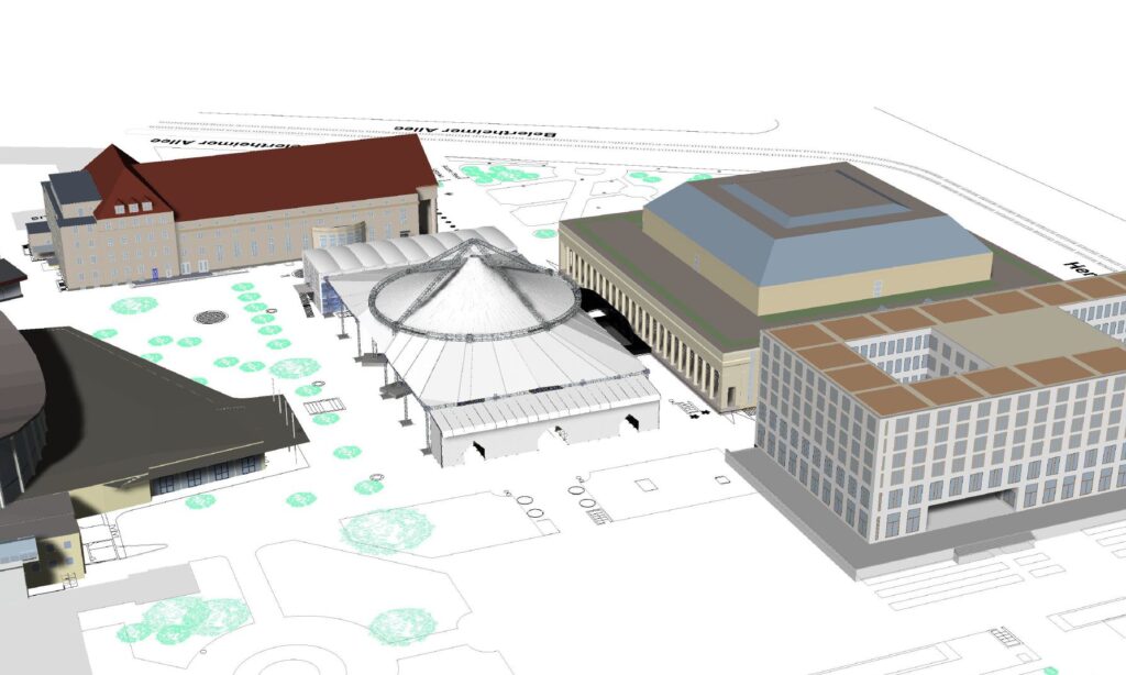 • Auf dem Festplatz werden über den gesamten Aufbauzeitraum der Magic Sky sowie Zelte am Brunnenplatz aufgestellt.