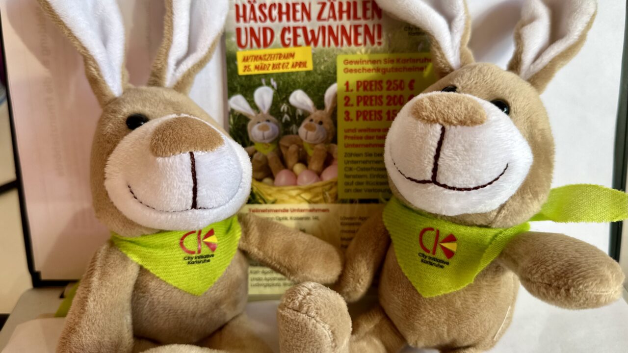 In den Schaufenstern der teilnehmenden Geschäfte* in der Karlsruher Innenstadt sind ab sofort kleine Plüsch-Osterhasen, die mit dem Logo der City Initiative bedruckt sind, versteckt. All diese versteckten Hasen gilt es zu zählen.