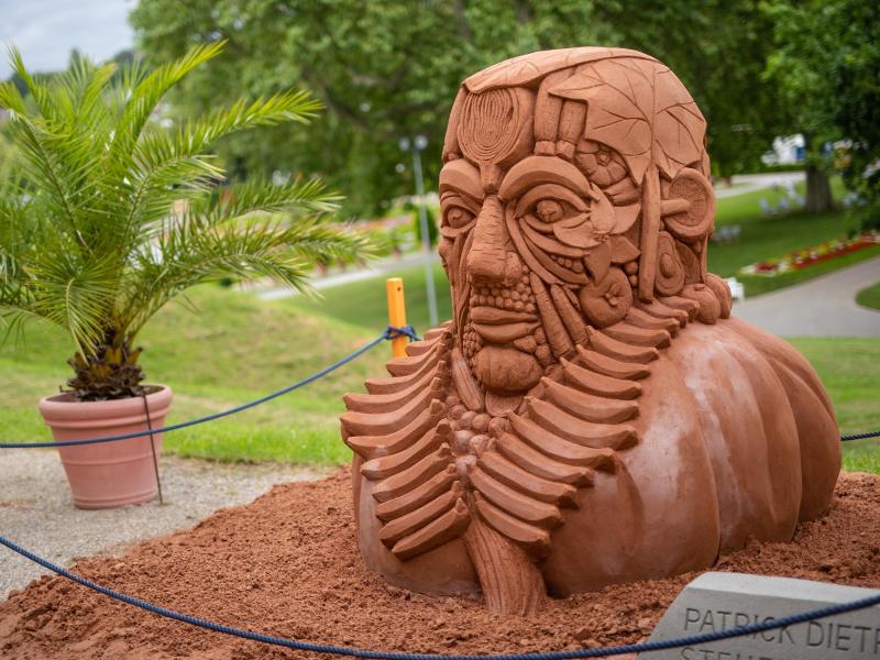 Zu sehen ist unter anderem ein Mann, der auf einem riesigen Kürbis liegt – eine Anspielung auf die traditionsreiche Kürbisausstellung, die ebenfalls Jahr für Jahr im Blühenden Barock stattfindet. Eine andere Skulptur zeigt eine tropische Insel auf felsigem Gestein – auf der Rückseite versehen mit dem Gesicht einer Frau, die eine Blüte im Haar trägt. Ein besonderes Sandgesicht setzt sich aus mit Sand geformten Gemüseteilen zusammen – getreu den Bildern des italienischen Malers Arcimboldo, der Gesichter aus Birnen, Trauben oder Maiskolben malte.